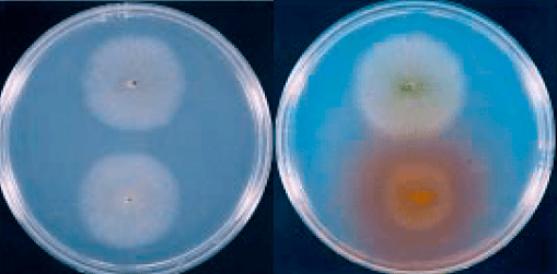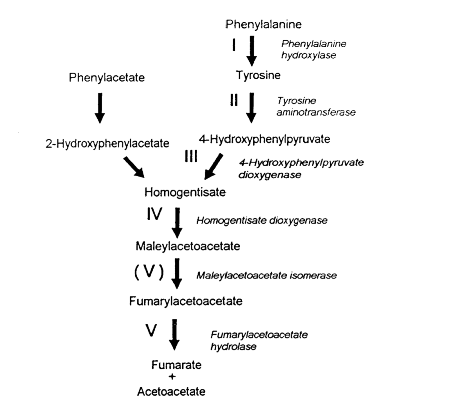 The alkaptonuric fungus happily growing on the bottom right on a mixture of lactose and phenylalanine; the red pigment excreted by the colony is pure homogentisic acid, due to the genetic block labeled as IV on the above scheme. With time, The red color turns into deep brown due to the formation of polyquinones, which in medical practice are known as the ochronotic pigment.